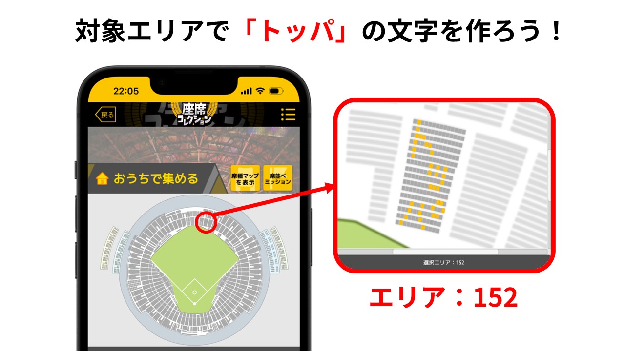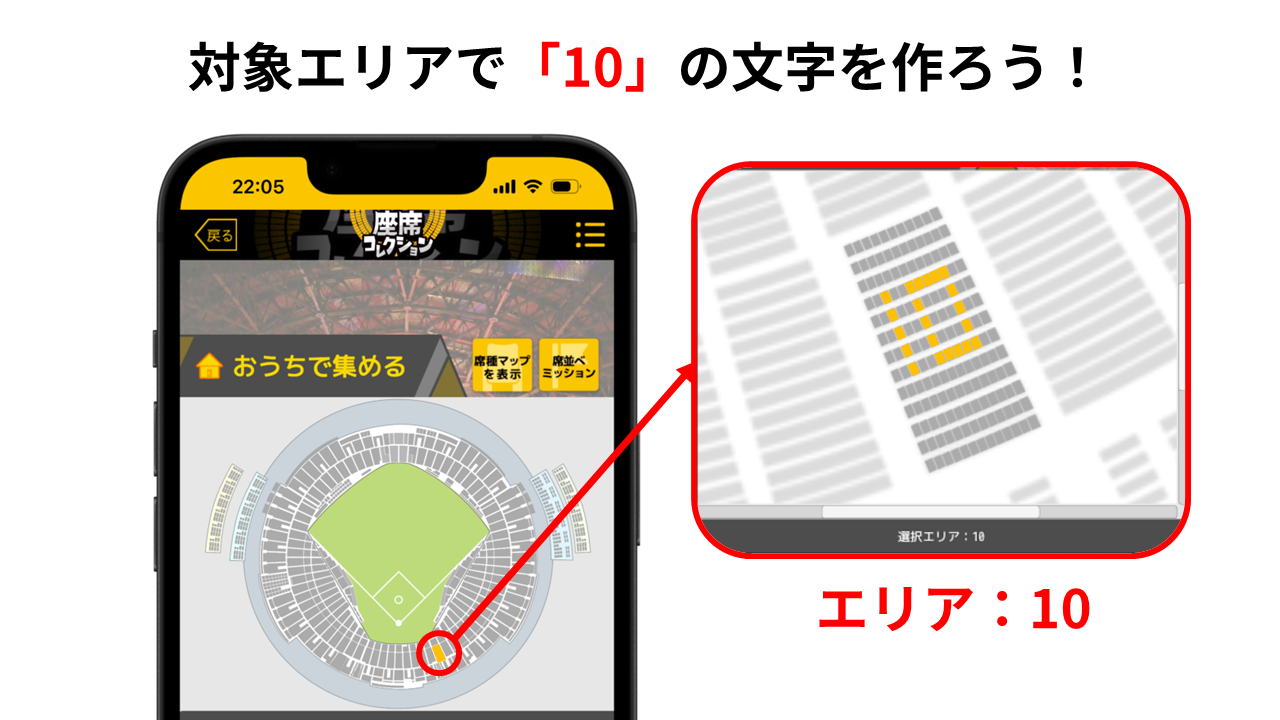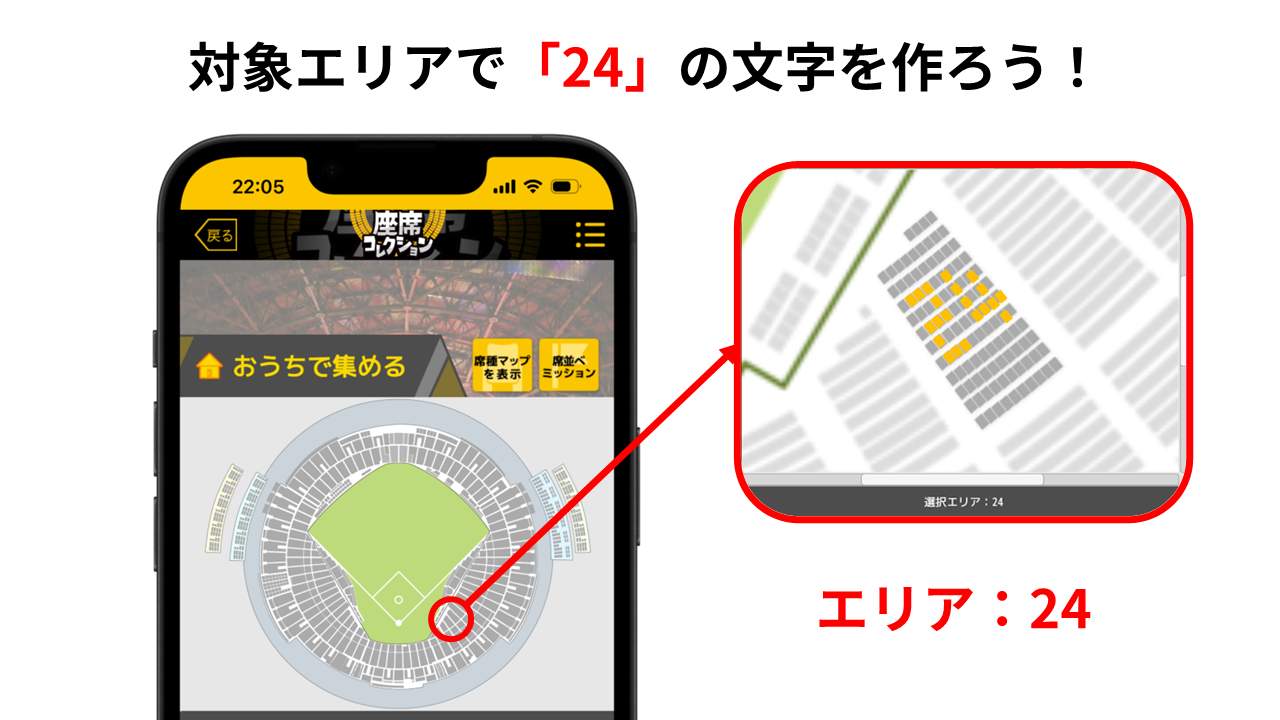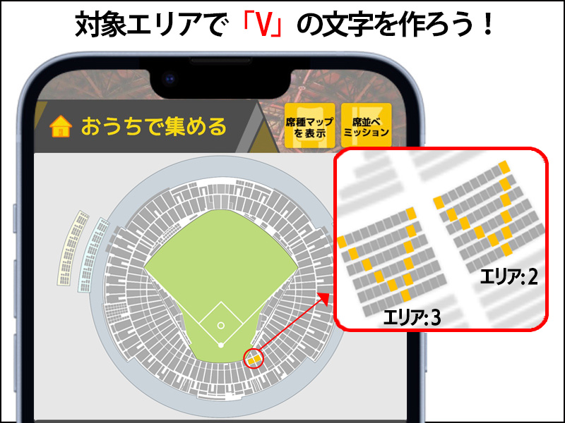 エリア指定座席獲得×5…球場マップ内の一部エリアを除いた全エリアから任意のエリアを5つ選択し、各エリア内で1席ずつランダムに座席を獲得。同じエリアを複数選択することも可能です。