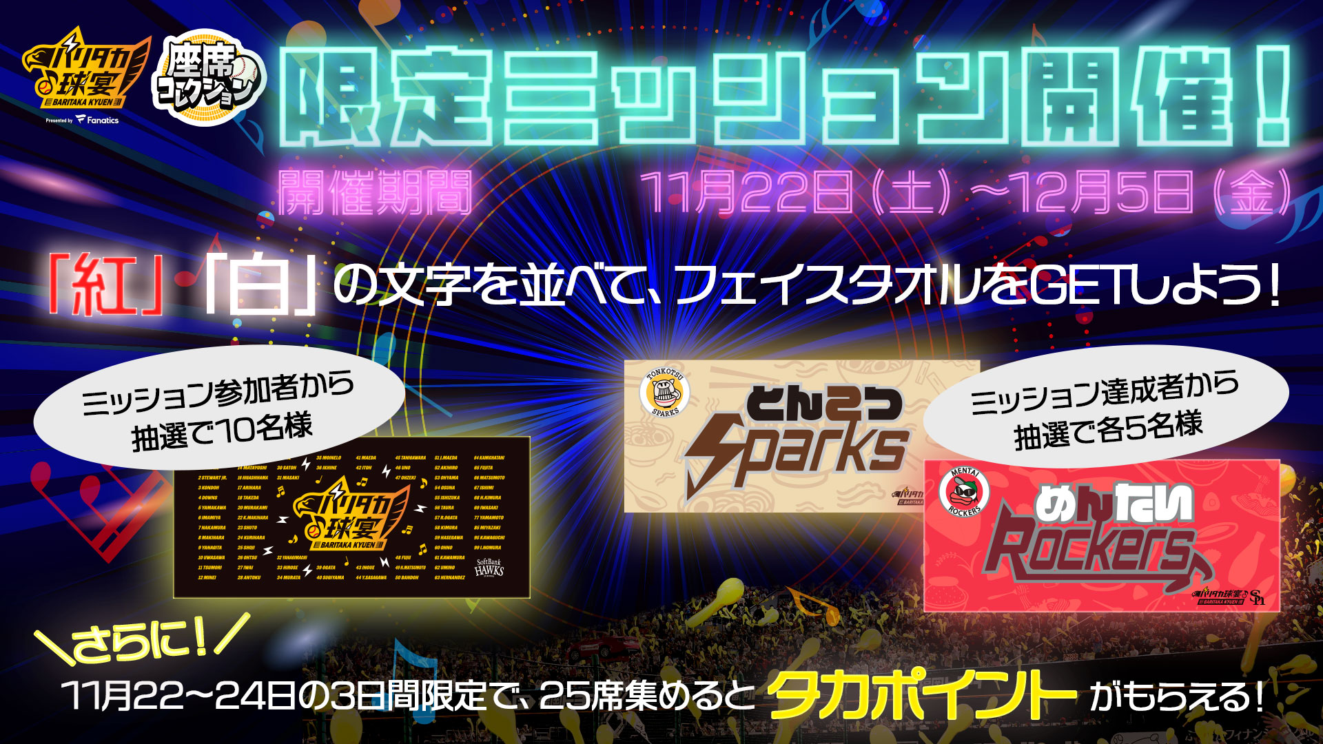 ファンフェスティバル2025「バリタカ球宴」限定ミッションを開催!ミッション参加・達成者の中から抽選でフェイスタオルが当たる! さらに、11月22日からの3日間限定で、25席以上集めるとタカポイントや限定アイテムがもらえる♪