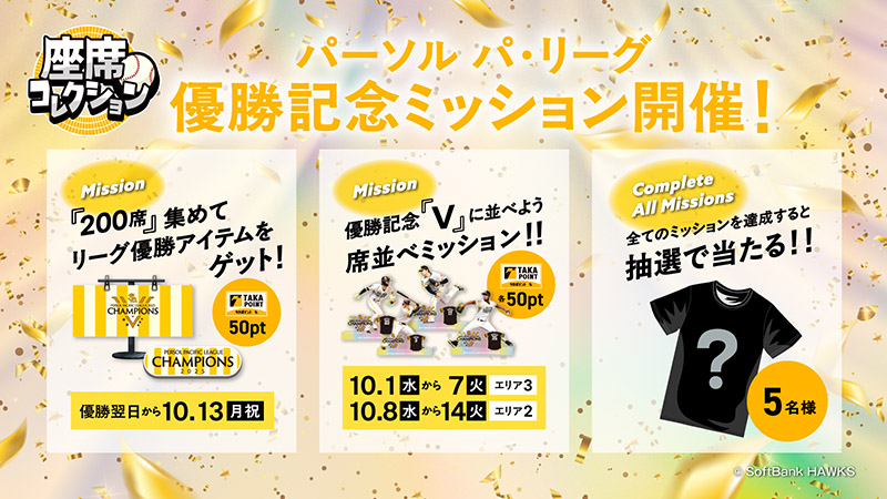 ホークスは2年連続となるパーソル パシフィック・リーグ優勝を達成しました!「座席コレクション」では、ファンの皆さまの熱いご声援に感謝して、期間限定特別ミッションを開始!