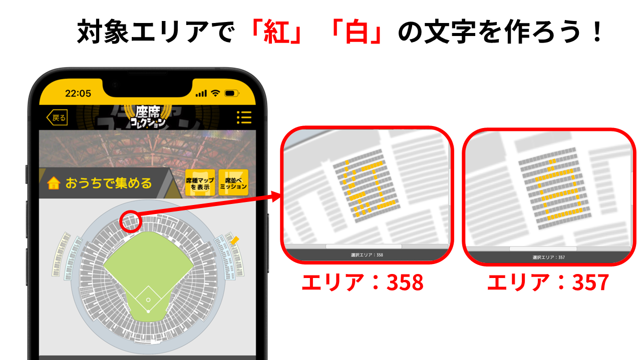 対象座席のうち1席でも獲得していない場合、未獲得の座席を獲得することでミッション達成となります。『紅』の【対象座席】3塁側 外野指定席(エリア:358)