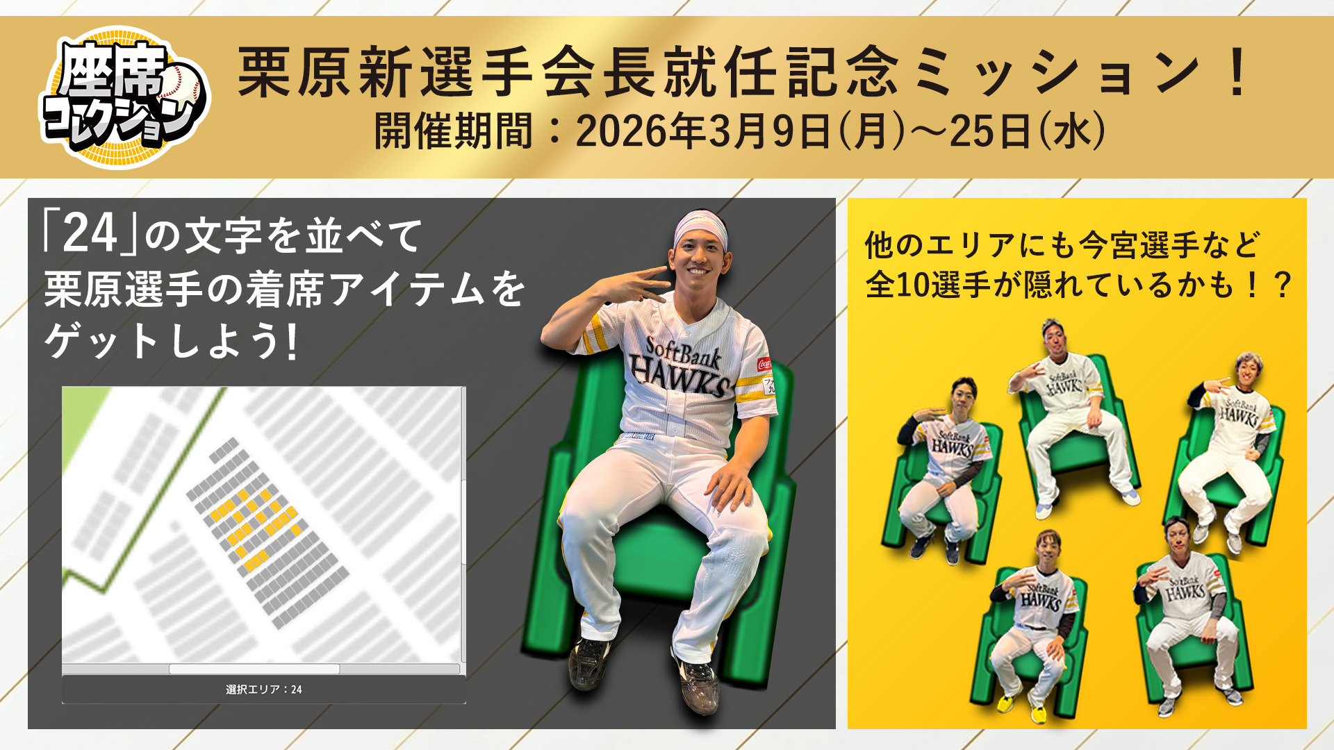 春季キャンプ2026 in 宮崎、スプリングトレーニング2026 in 筑後の各キャンプ地で、「座って集める」から二次元コードを読み込むと「観戦記録証」がもらえる他、アプリ内に飾れるコレクションアイテムやタカポイントがもらえます。